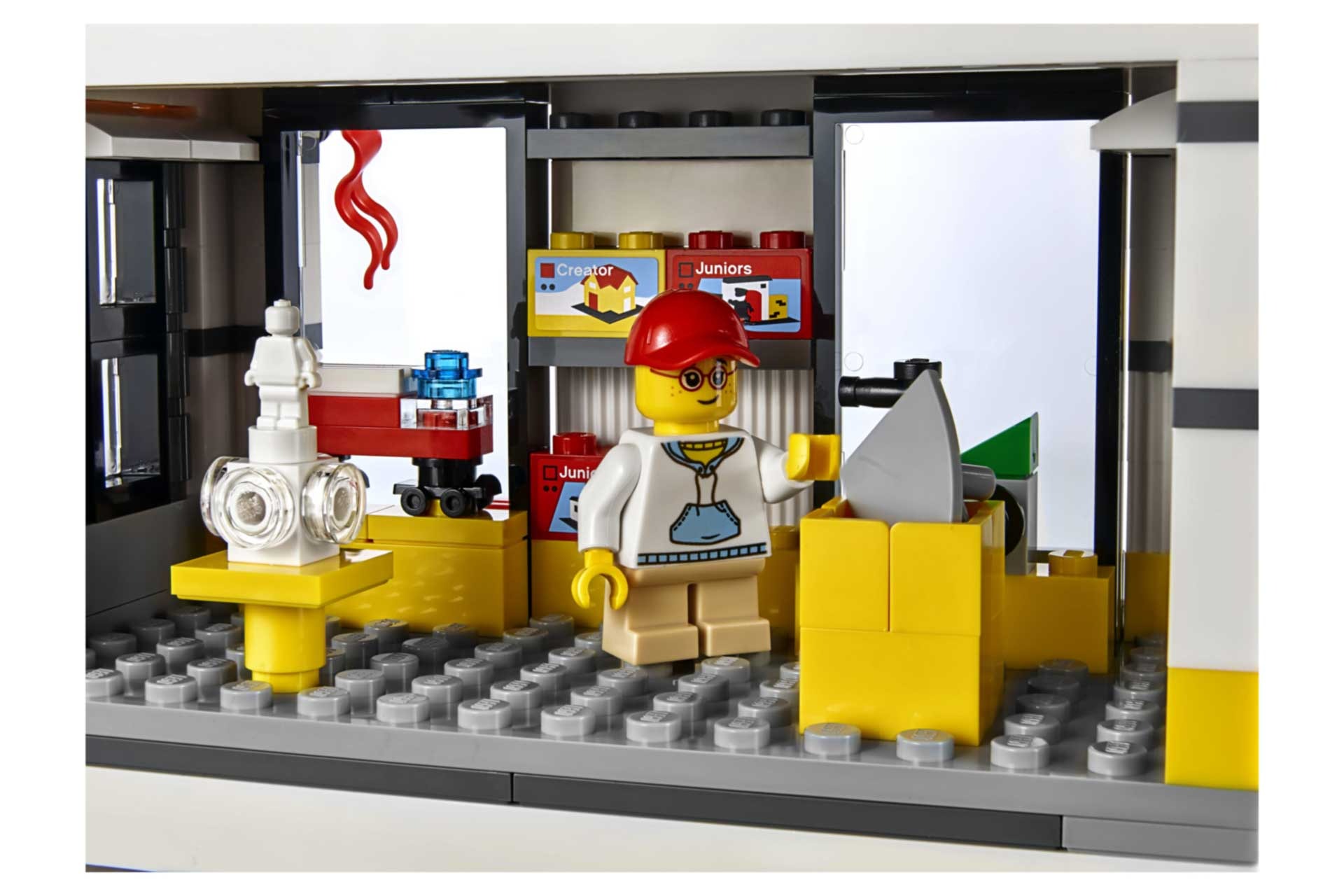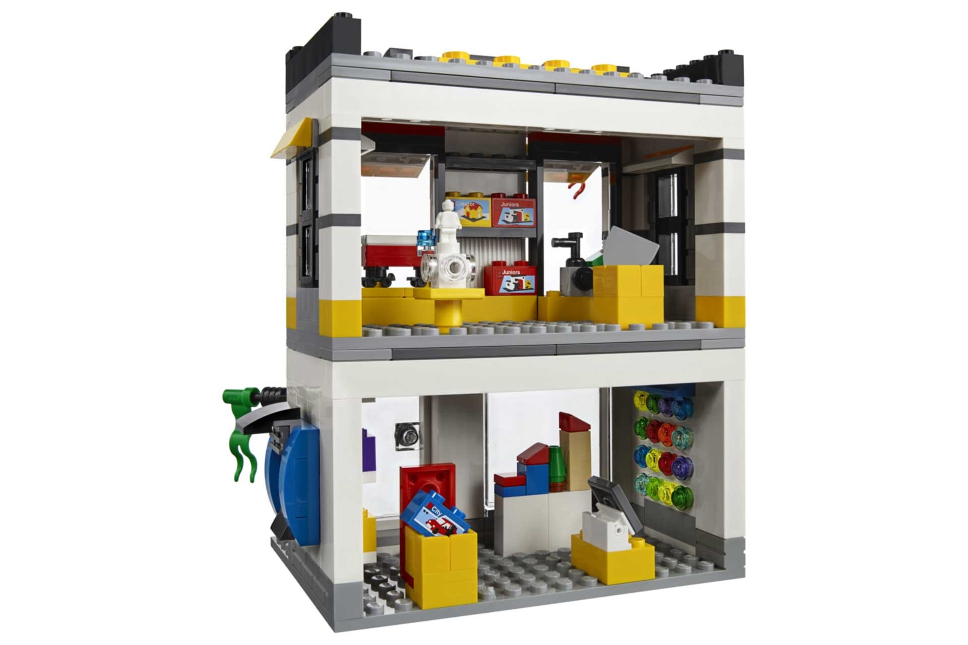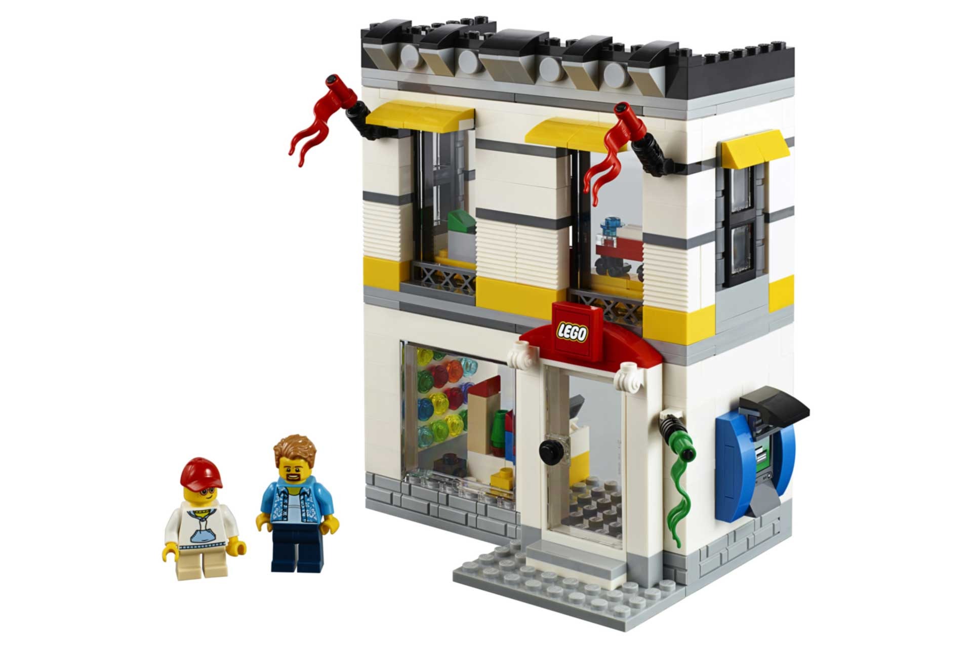 - De winkel heeft een gedetailleerde gevel met een doorzichtige deur die open kan, 3 ramen, 3 vlaggen en een LEGO® uithangbord, plus een gedetailleerd interieur met een ‘Kies & bouw’-muur, een ‘Bouw een minifiguur’-display, rekken gevuld met LEGO dozen en een toonbank met kassa.