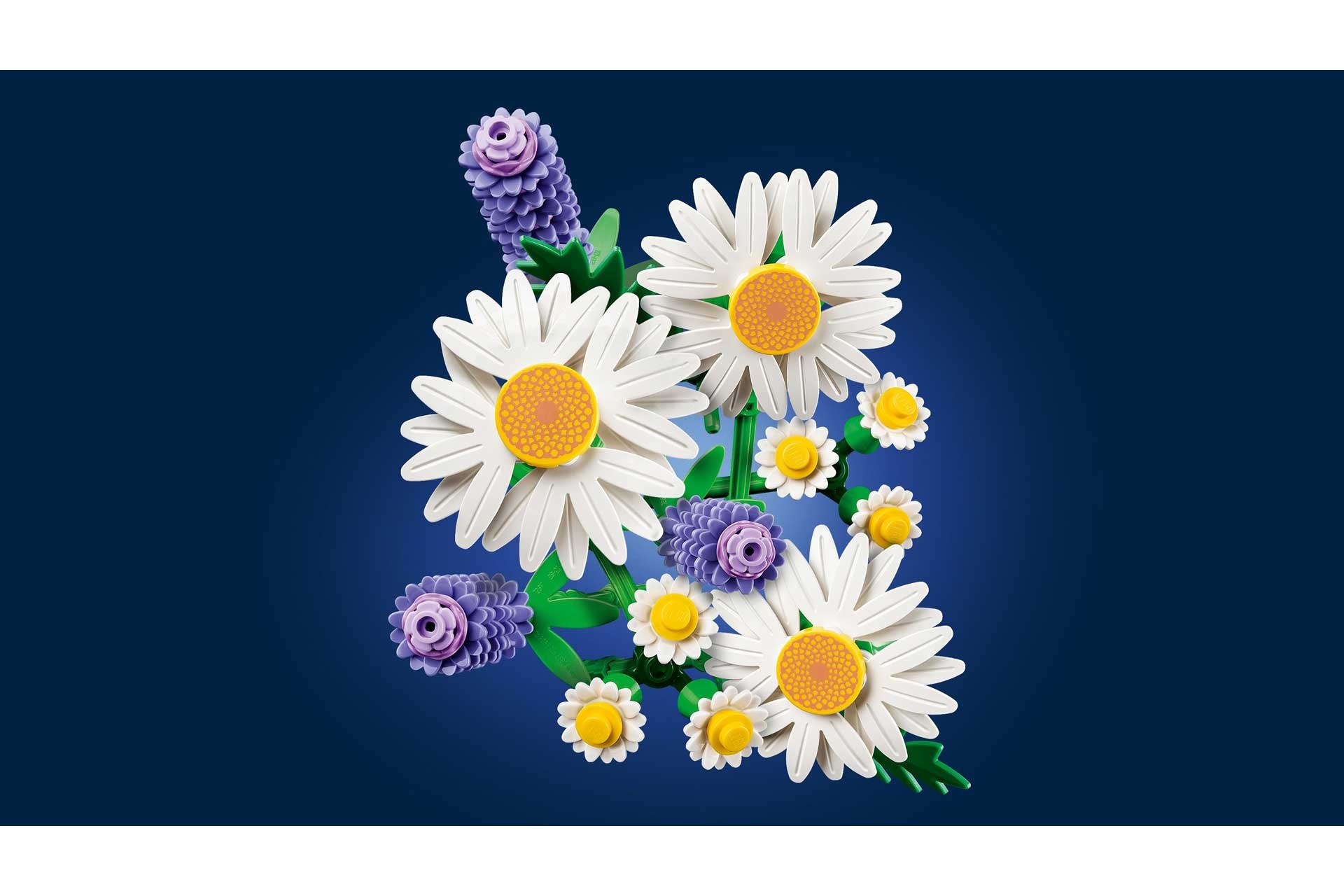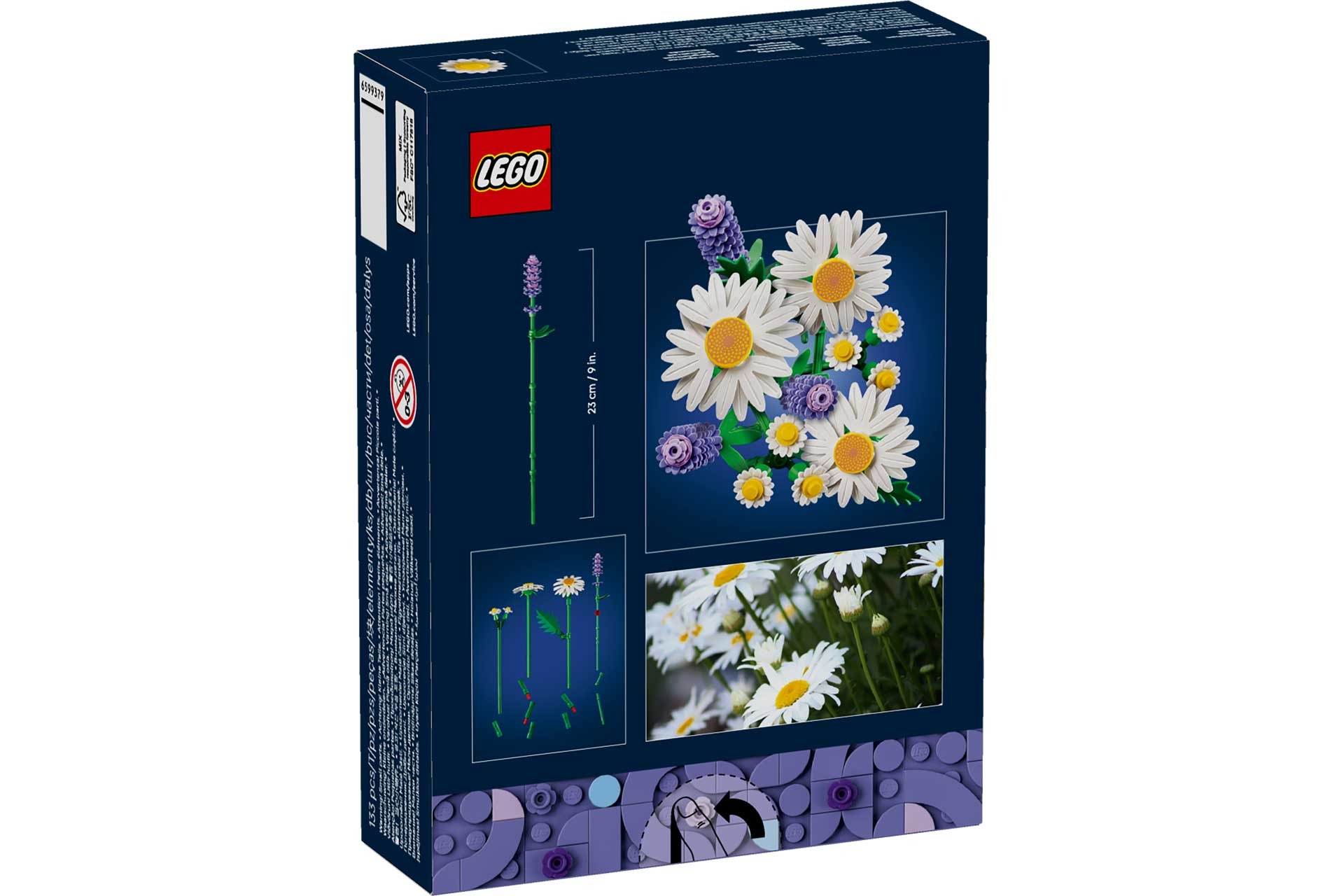 - LEGO® BLOEMENBOEKET – jonge bloemisten zullen veel plezier beleven aan het bouwen van 3 grote madeliefjes, 2 stengels met kleine madeliefjes, 3 rustgevende lavendeltakken en groene stengels