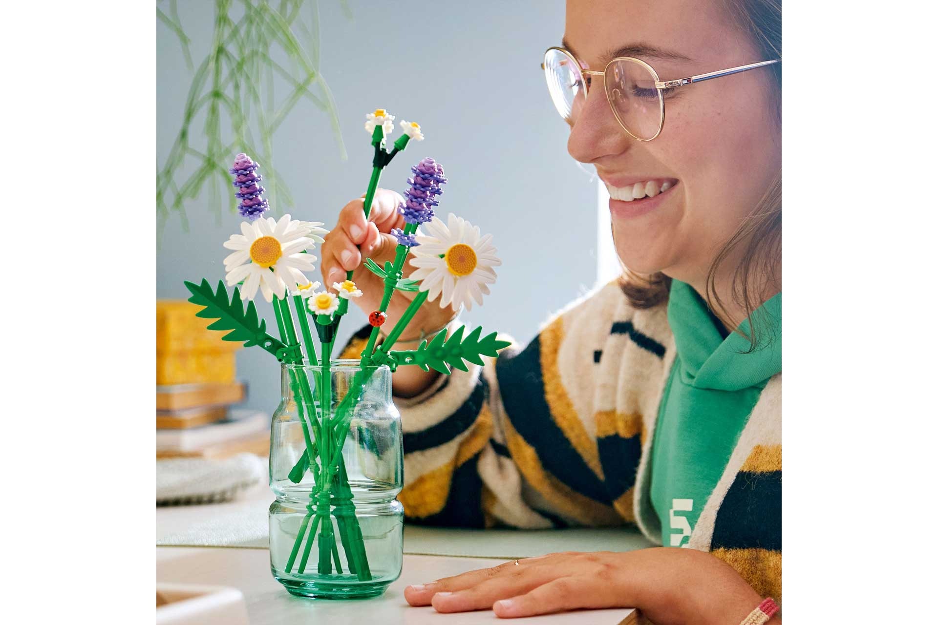 - NATUURLIJKE DETAILS – de LEGO® madeliefjes zijn zeer gedetailleerd en authentiek en als je goed kijkt, kun je een klein lieveheersbeestje op een van de lavendeltakken zien zitten