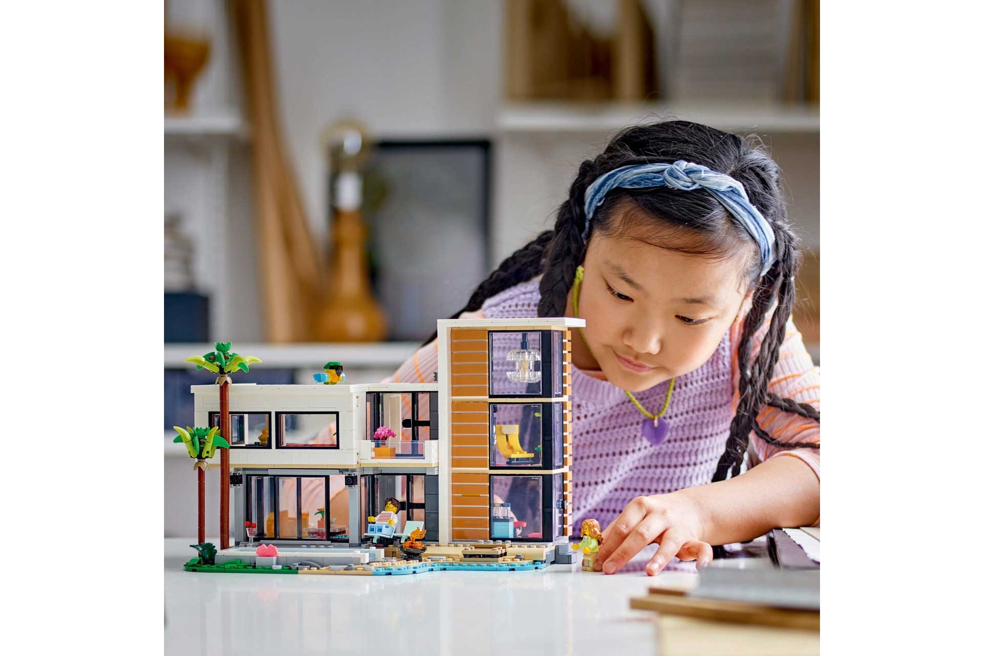 Het moderne huis (LEGO 31153) en het stadsgebouw van 3 verdiepingen bieden toegang tot de kamers vanaf de achterkant, terwijl de boshut een dak heeft dat kan worden geopend. Inclusief 2 minifiguren met verwisselbare outfits. Elk van de 3 modellen kan worden gemaakt met behulp van de LEGO Builder app voor een leuke digitale ervaring.