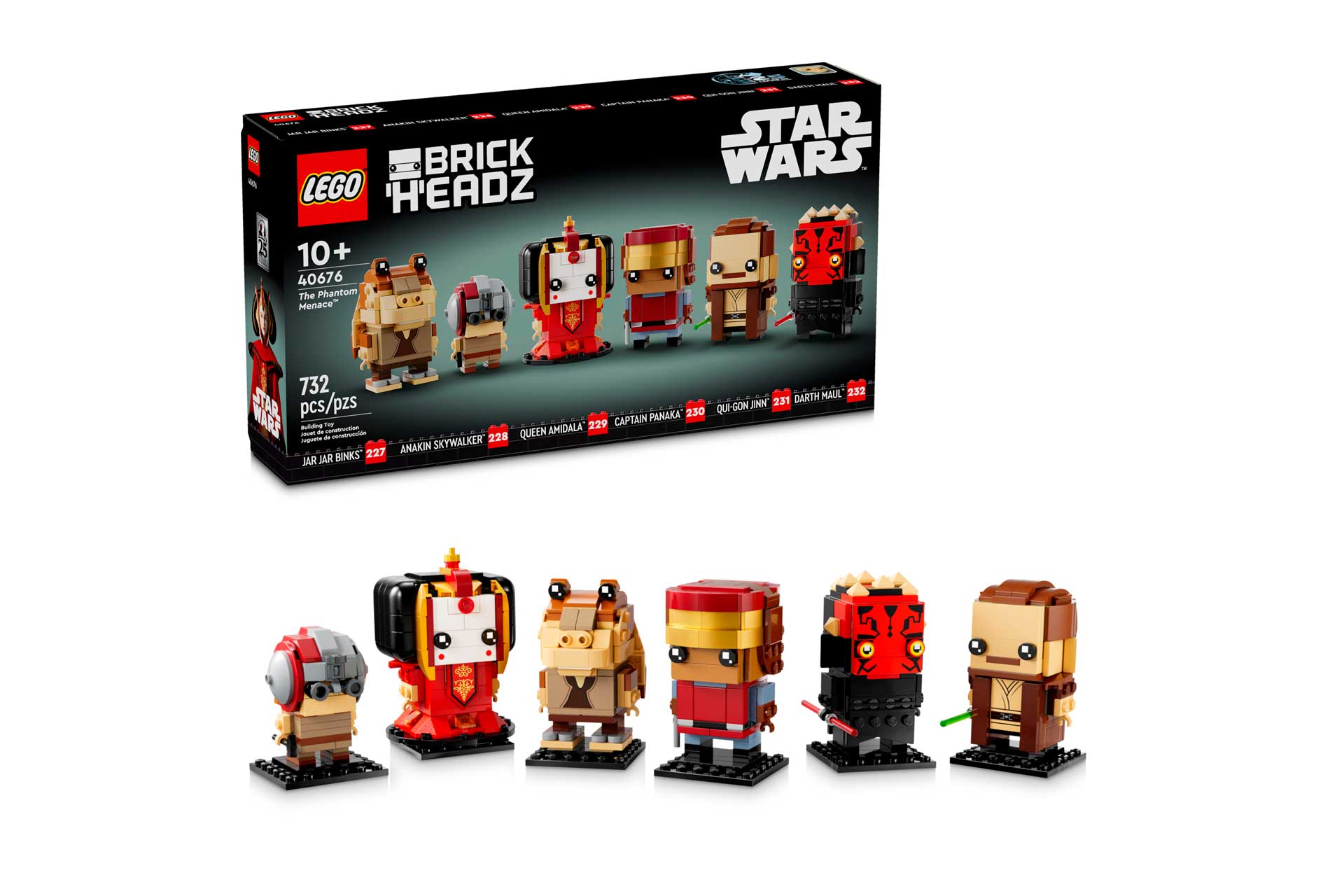 Vier het 25-jarig jubileum van Star Wars: The Phantom Menace en LEGO® Star Wars™ bouwsets met deze bouw- en displayset van 6 LEGO BrickHeadz™ figuren (LEGO 40676) om te verzamelen. Dit coole cadeau voor Star Wars fans bevat bouwbare LEGO figuren van Jar Jar Binks, Anakin Skywalker, koningin Amidala, kapitein Panaka, Qui-Gon Jinn en Darth Maul, elk met bouwplaten en authentieke accessoires zoals de hamer van de jonge Anakin en het rode dubbelbladige lichtzwaard van Darth Maul.