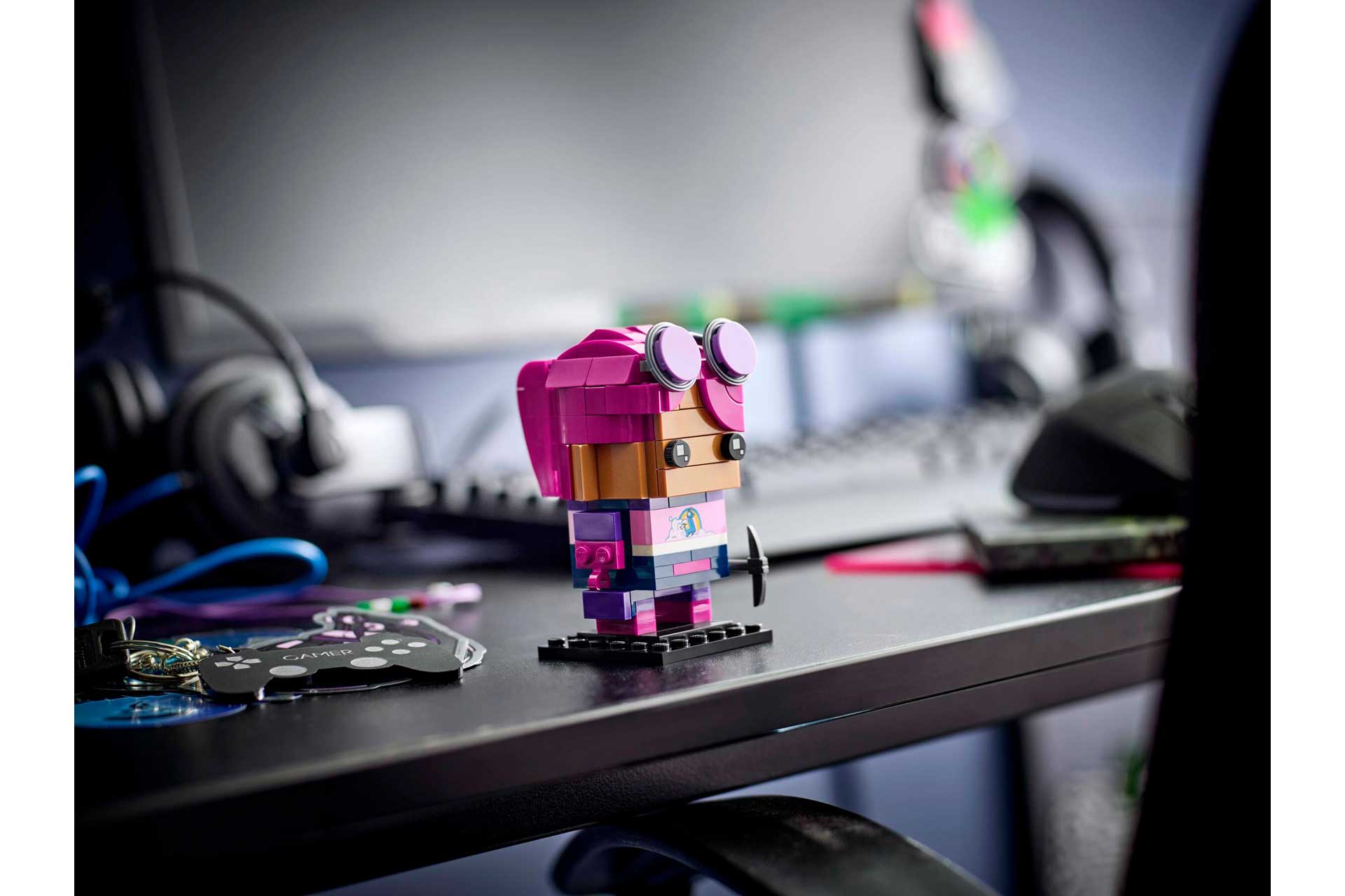 - Direct herkenbaar – de bouwbare figuur is gebaseerd op de bekende Brite Bomber uit Fortnite en heeft roze haar, een zonnebril en een houweel