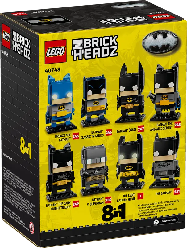 Met de LEGO® BrickHeadz™ Batman™: Batman 8-in-1 figuur (40748) kunnen kinderen een Batman model bouwen in een van de volgende stijlen: (1) Batman uit de bronstijd; (2) Batman klassieke tv-serie; (3) Batman (1989); (4) Batman: De animatieserie; (5)Batman The Dark Knight trilogie; (6) Batman vs. Superman; (7) De LEGO Batman film met ogen die oplichten in het donker; en (8) The Batman. Deze 8-in-1 BrickHeadz set is een geweldig cadeau voor kinderen vanaf 10 jaar om te bouwen, mee te spelen en neer te zetten. (LEGO 40748)