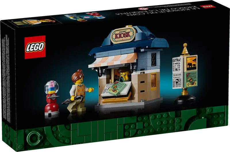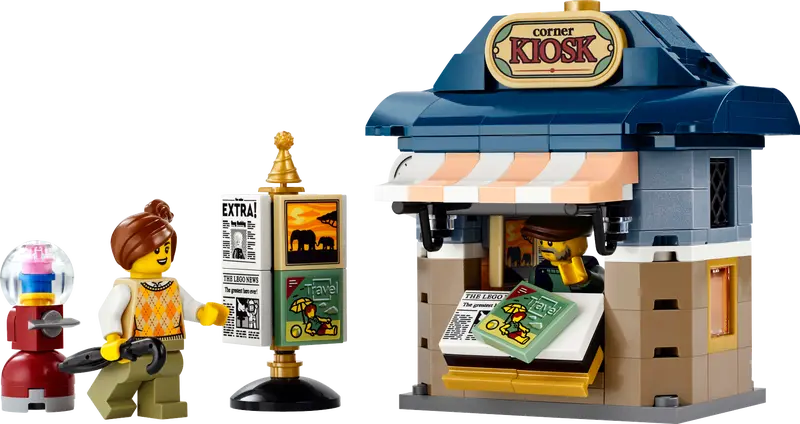 - Wat zit er in de doos – alles wat je nodig hebt om een ouderwetse kiosk, een displayzuil en een kauwgomballenautomaat te bouwen, plus minifiguren van een verkoper en een klant