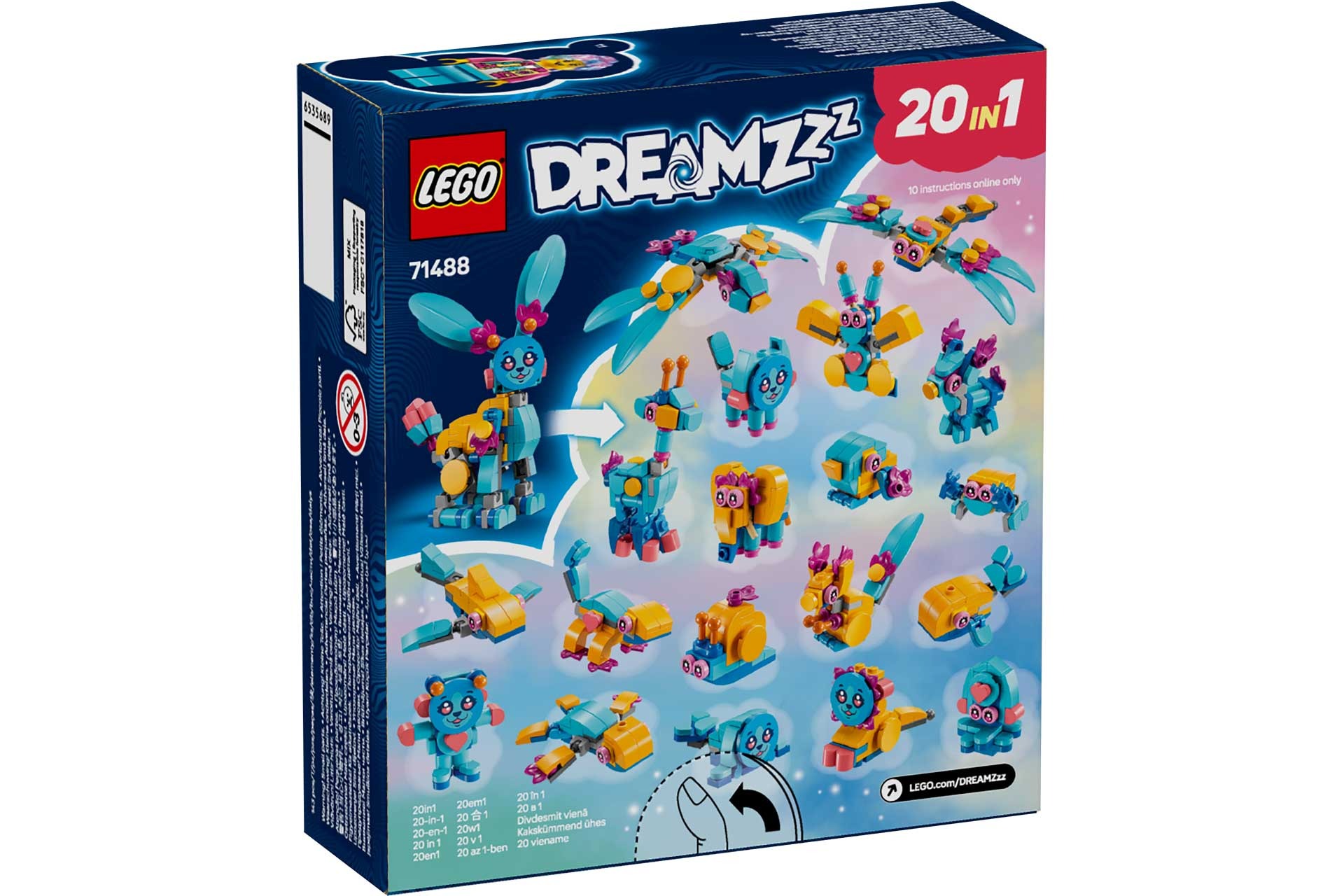 De creativiteit krijgt een boost als kinderen een schattige figuur van Bunchu bouwen met verstelbare benen, armen, voeten, staart en oren, voordat ze hem ombouwen tot een van de 19 andere speelgoeddieren: een leeuw, schildpad, hert, vlinder, libel en meer! De set wordt tot leven gebracht door een minifiguur van Izzie in een nieuwe outfit met een knuffelaccessoire. De set stimuleert creatieve rollenspellen waarin kinderen nieuwe avonturen bedenken voor de LEGO DREAMZzz heldin en haar trouwe konijn.