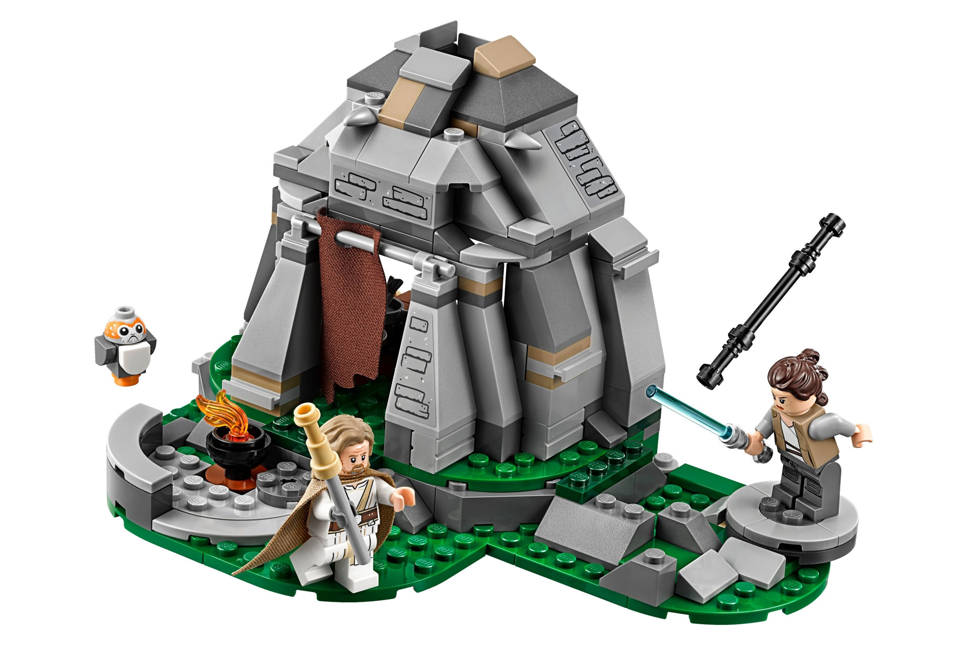 - De set bestaat uit een bouwbare hut met afneembaar dak voor eenvoudige toegang tot het interieur, met onder andere een opklapbaar bed en een kleine keuken. Je vindt er ook een deur van stof, een zitstok voor de Porg, een klein kampvuur om zelf te bouwen en een trainingsfunctie met rotsblok dat opengeslagen kan worden.