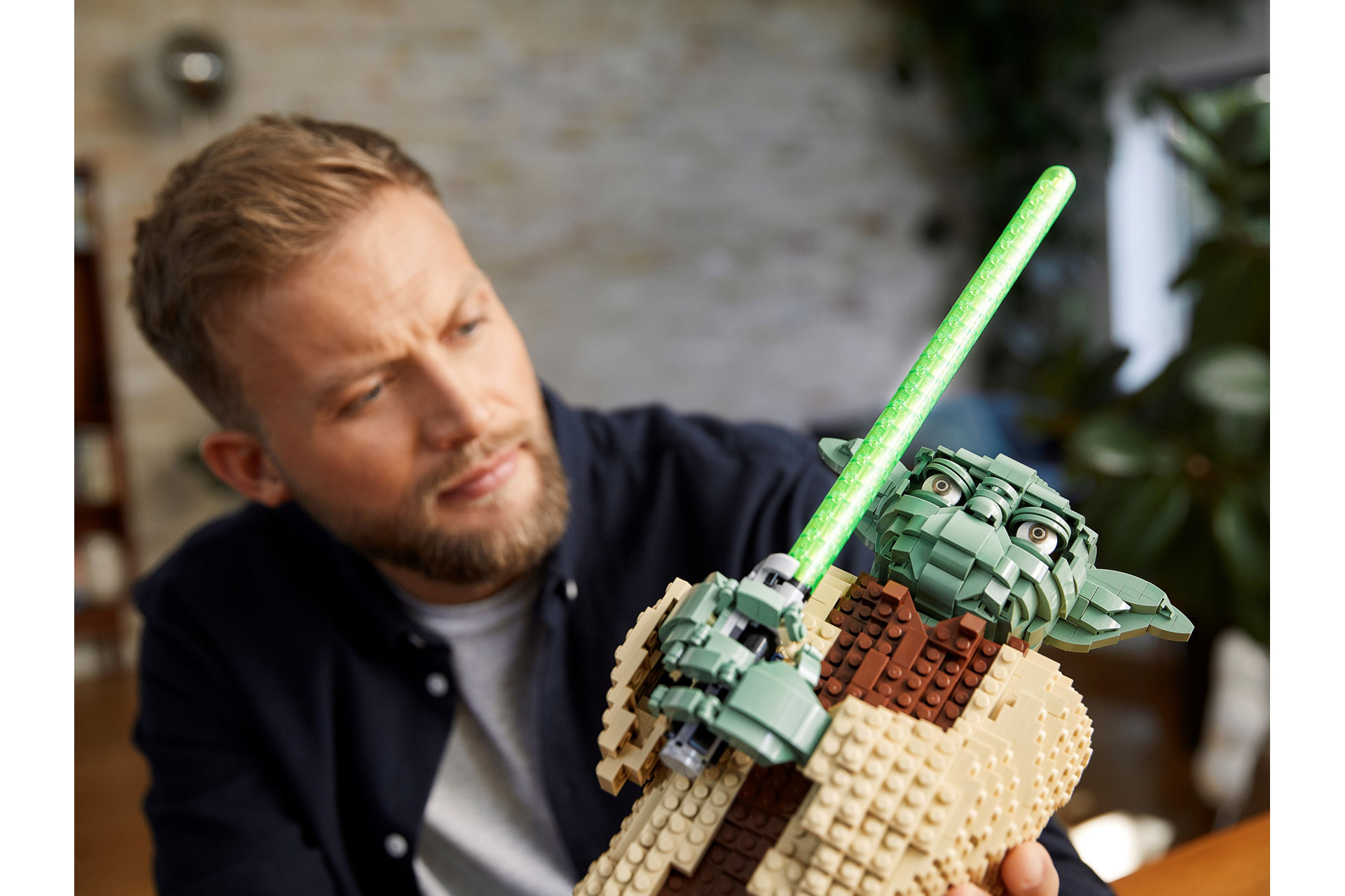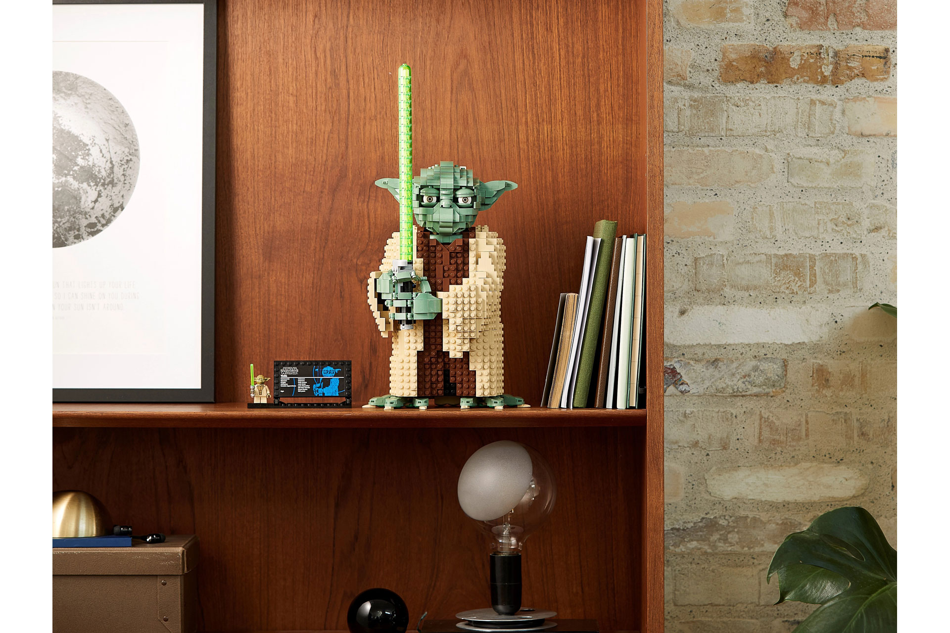 - Met veel details, een verstelbaar hoofd en wenkbrauwen, beweegbare vingers en tenen, het groene lichtzwaard van Yoda en een informatieplaatje met feitjes over de Jedimeester, plus een standaard voor de meegeleverde Yoda minifiguur en het lichtzwaard. (LEGO 75255)