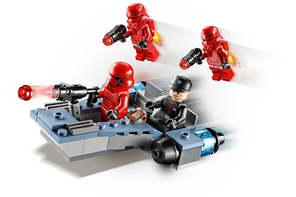 - Met de 4 coole minifiguren – een First Order Officer, een Sith Trooper en 2 Sith Jet Troopers – die zijn uitgerust met 4 noppenschietende blasters en 2 jetpackelementen, hebben kinderen meer dan genoeg inspiratiebronnen voor creatieve verhalen.