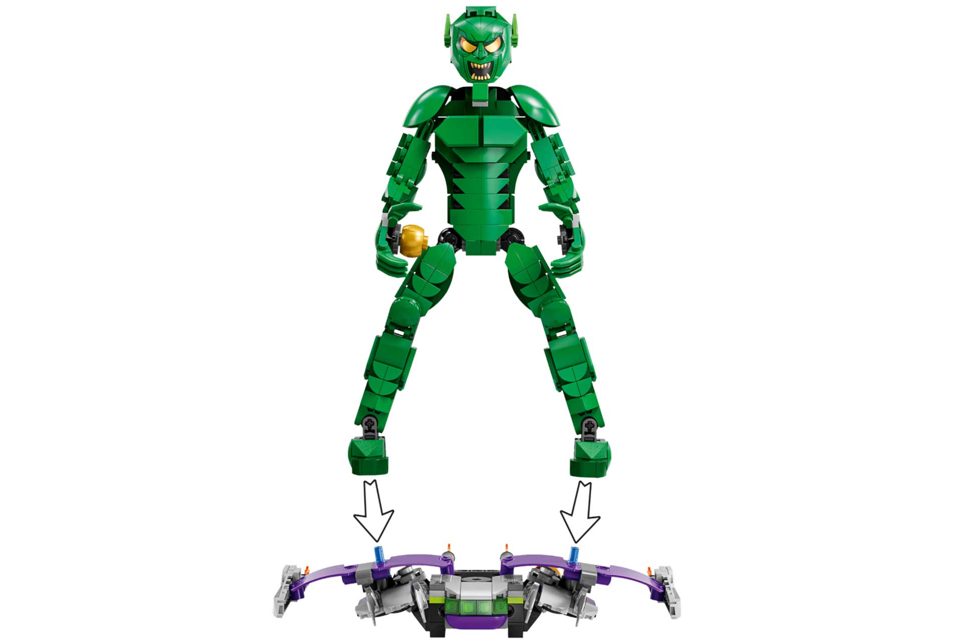 - Verstelbare bouwfiguur – dankzij de beweegbare schouder-, arm-, heup- en beengewrichten kunnen kinderen coole actiehoudingen creëren terwijl de Green Goblin eindeloze spannende avonturen beleeft