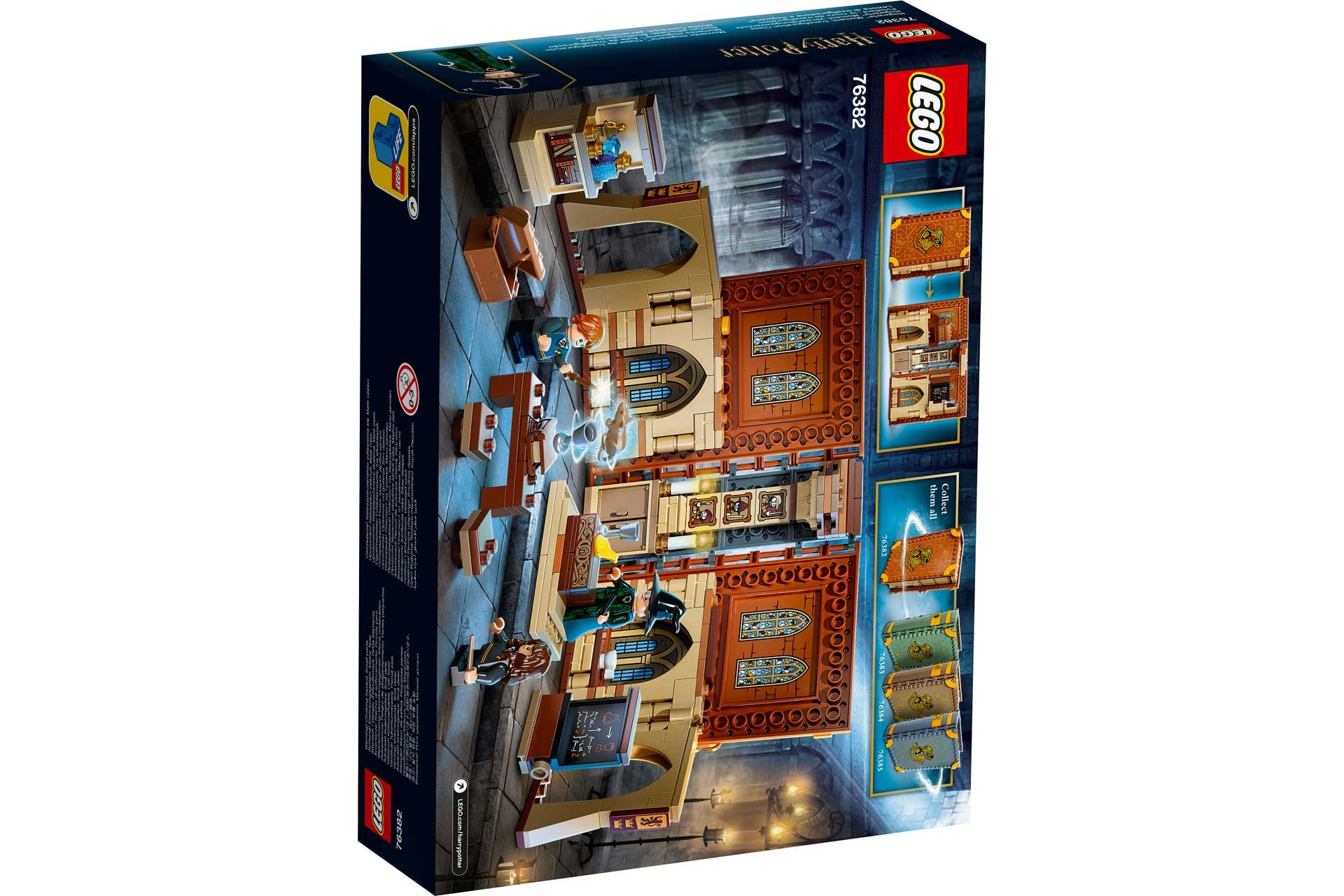 Deze betoverende set zit vol functies en accessoires voor eindeloze rollenspellen. Sommige zitten vast, zoals de voorraadkast, terwijl andere los zijn, zoals de meubels en het schoolbord. Je kunt deze magische Harry Potter set (LEGO 76382) combineren met andere sets in de collectie. Elke set is ontworpen met een eigen kenmerkende kleur en een uniek motief, en neemt kinderen mee naar verschillende klaslokalen op Zweinstein. Je kunt het volledige assortiment ook aan elkaar vastmaken voor een 360 graden-speelervaring op Zweinstein.